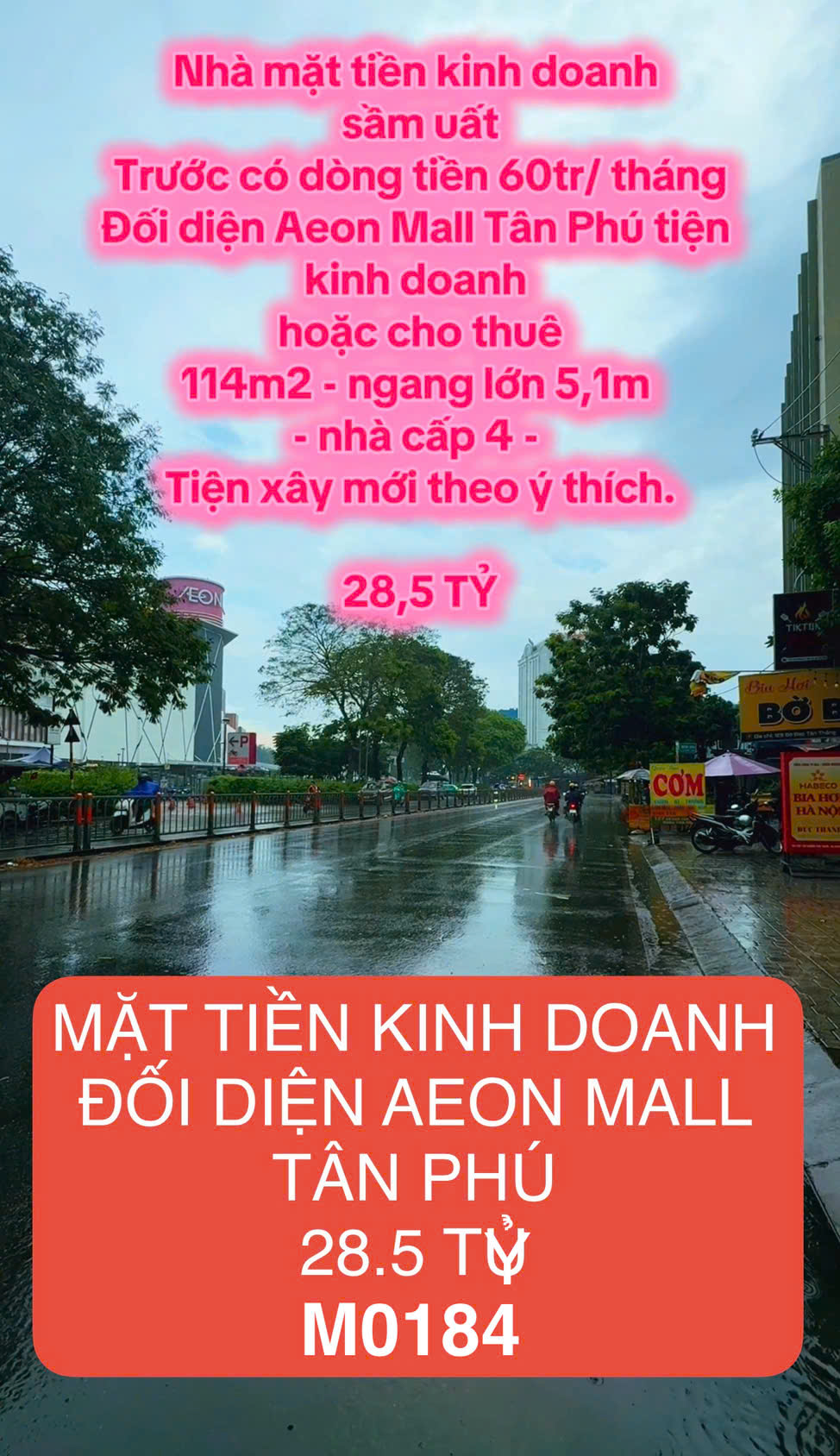 MẶT TIỀN KINH DOANH BỜ BAO TÂN THẮNG - TÂN PHÚ - ĐƯỜNG 30M CÓ VỈA HÈ 5M - ĐỐI DIỆN AEON MALL TÂN PHÚ - 114M2 - NHÀ C4 TIỆN XÂY MỚI THEO Ý THÍCH - TRƯỚC CÓ DÒNG TIỀN 60TR/TH - 28,5 TỶ - M0184